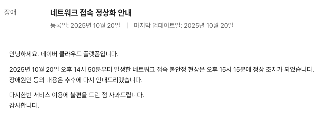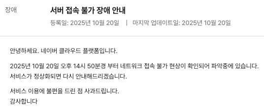 그리고 댓글에는 ncp측에서 확인할수 있는 장애발생 공지글도 확인할수있는곳을 알아냈다.