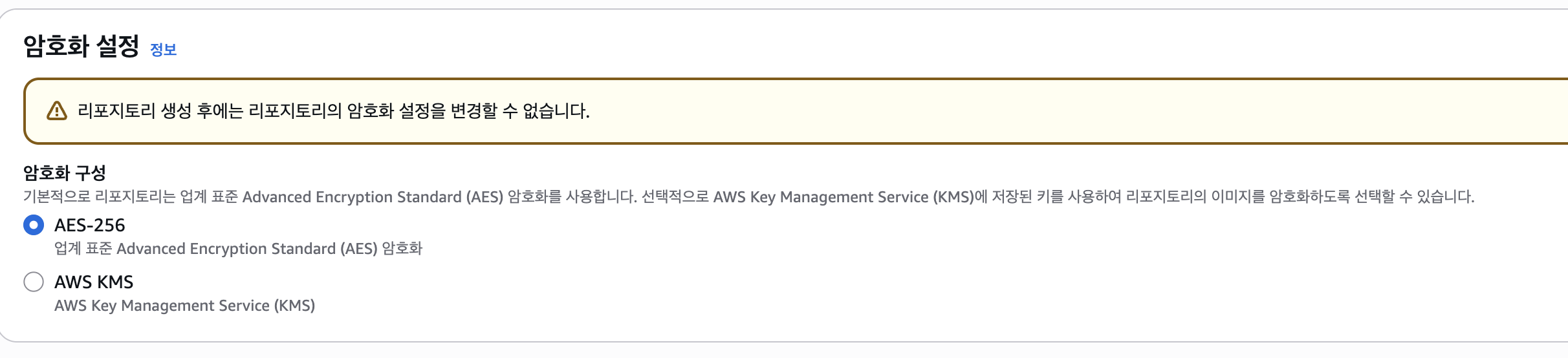 옵션설명 참고👉 (ECR에서 이미지를 올리게 되면 S3로 저장할 때 기본적인 AES-256 암호화 알고리즘을 사용하여 유휴 데이터를 암호화를 하여 저장하게 됩니다. 하지만 KMS 암호화를 키게 되면 AWS Key Management Service에 저장된 KMS 키로 서버 측 암호화를 사용할 수 있습니다.)