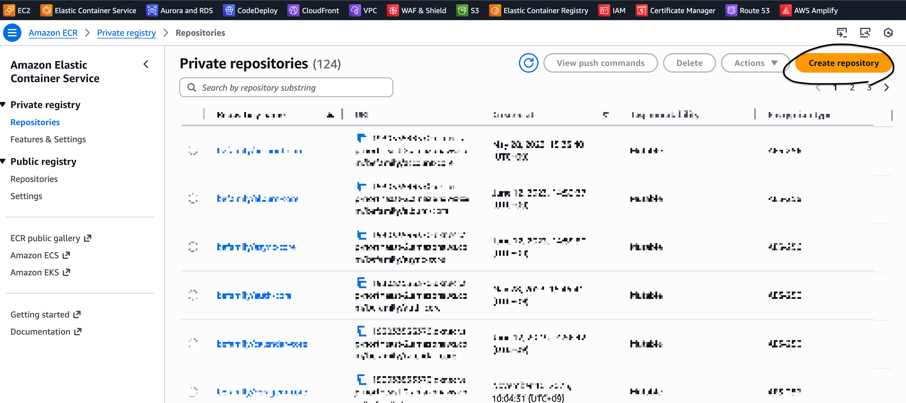 한마디로 도커 허브와 같은 컨테이너의 이미지를 관리하는 레지스트리 서비스 이다.1. Amazon ECR - (private or public) registry repositories - create repository